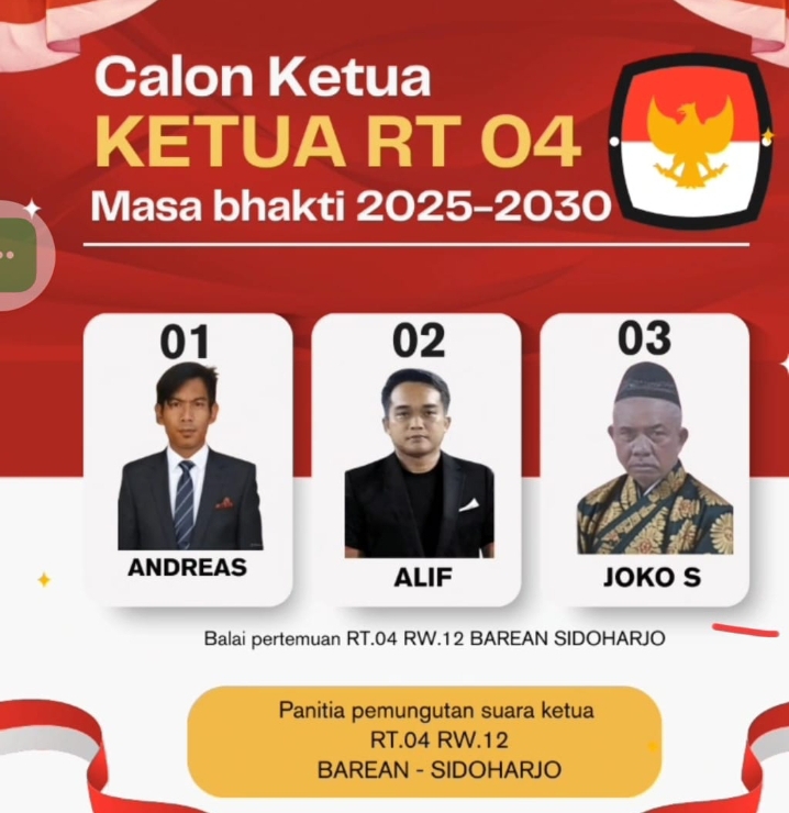 “Saya berterima kasih kepada seluruh warga RT 04 kususnya mas Marno CS salah satu panitia yang sudah mewujutkan memilih pemimpin, RT itu penting sekali, tanpa RT , RW ya tidak bisa apa -apa, begitu juga kelurahan.” ucap Sudarmaji S. H Lurah Sidoharjo dalam sambutanya usai acara pilihan. (17/9/2025)